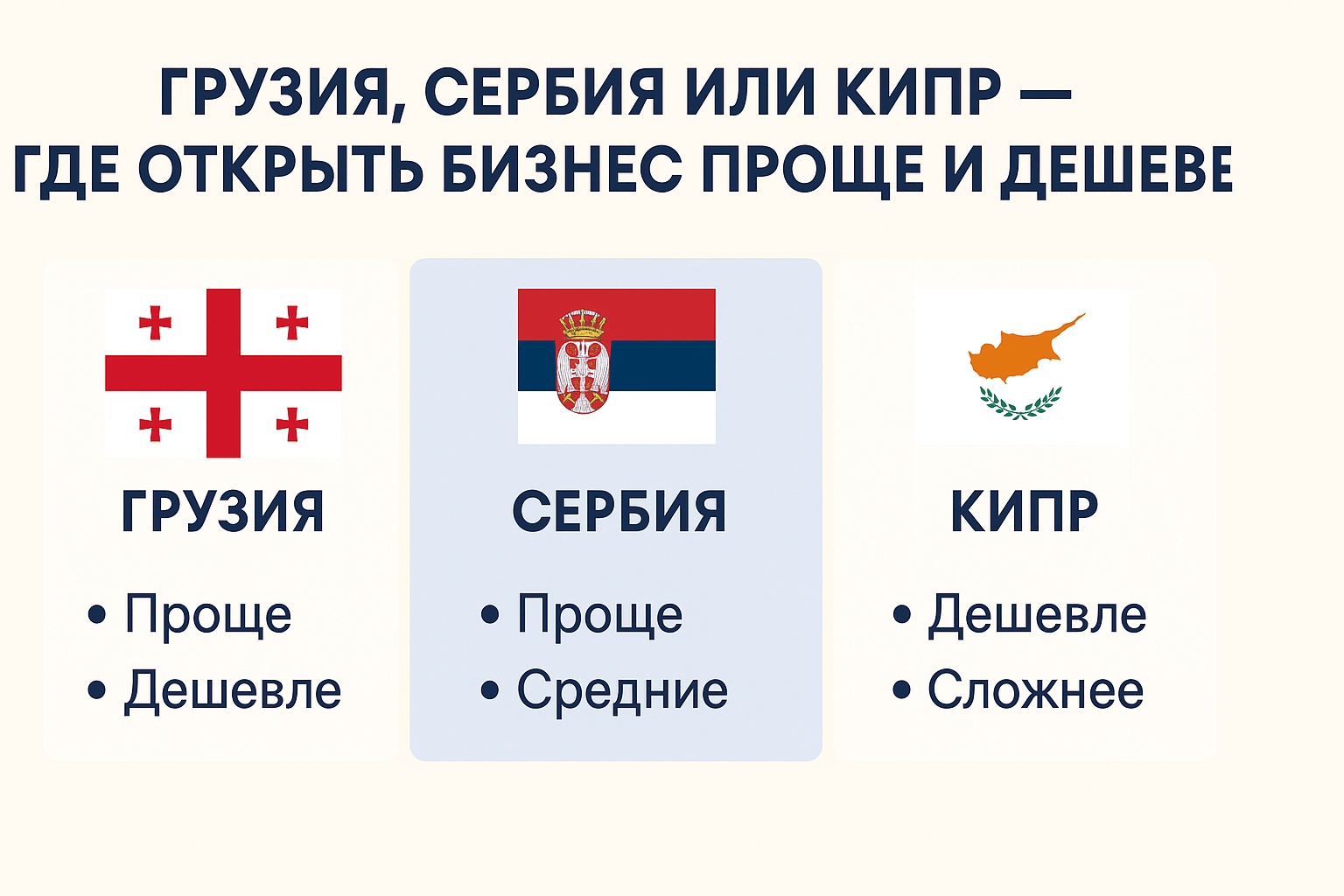 В 2025 году предприниматели чаще всего рассматривают три направления: Грузию, Сербию и Кипр. Каждая страна предлагает свой баланс между простотой, стоимостью и престижем.