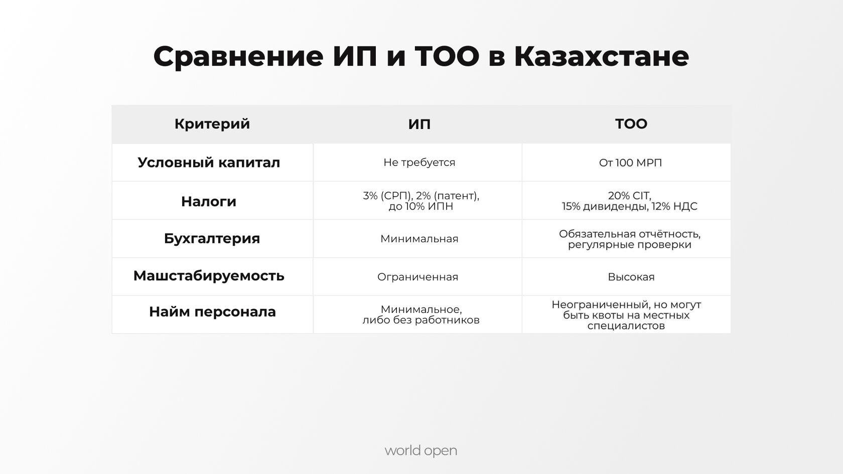 Команда World Open поможет открыть ИП или ТОО в Казахстане, рассчитать налоги и сопровождать отчётность: